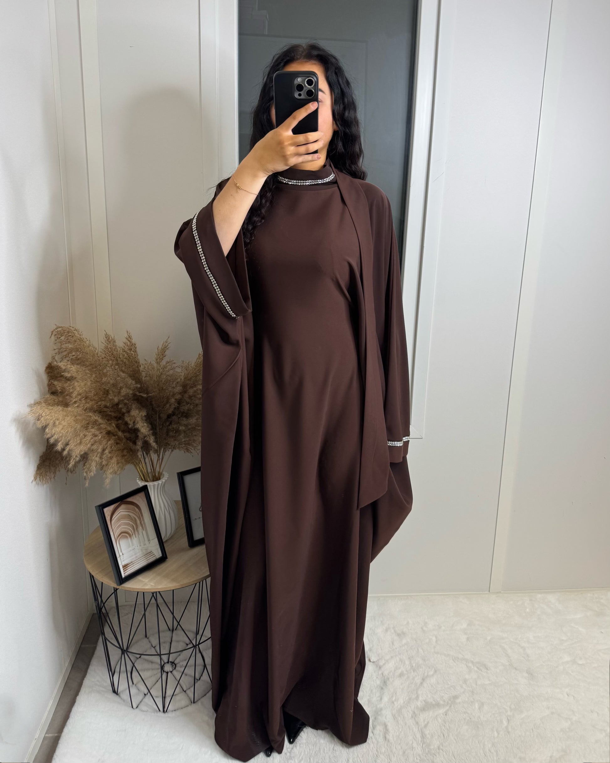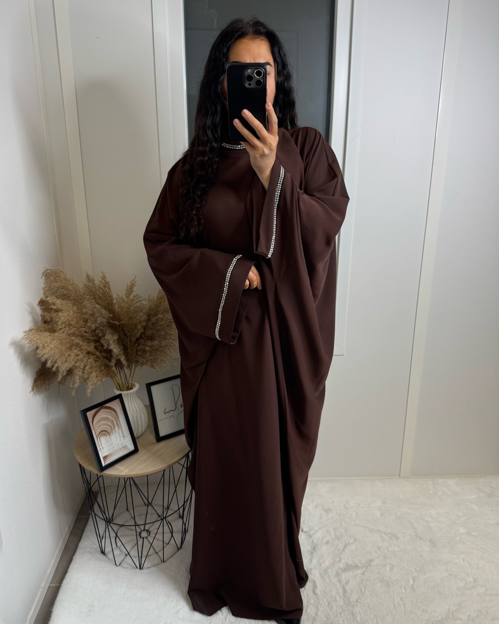 Découvrez l'Abaya col Leïla, ornée de strass délicats sur les manches. Ce vêtement allie élégance et modernité, apportant une touche de sophistication à votre tenue. Parfaite pour des occasions spéciales, elle sublime votre silhouette tout en vous offrant un confort inégalé.