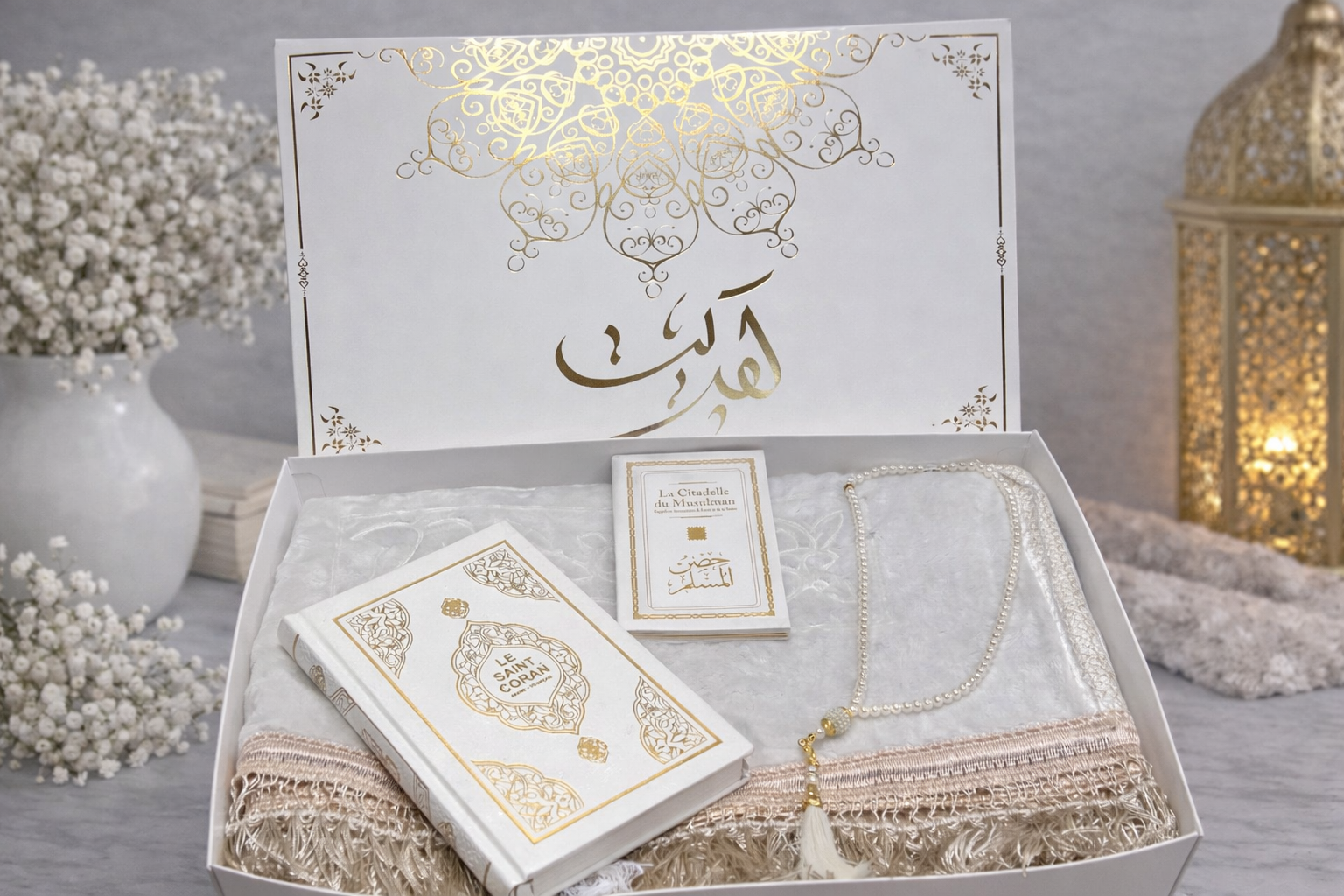 Coffret blanc (Tapis, Coran, Citadelle et Tasbih)